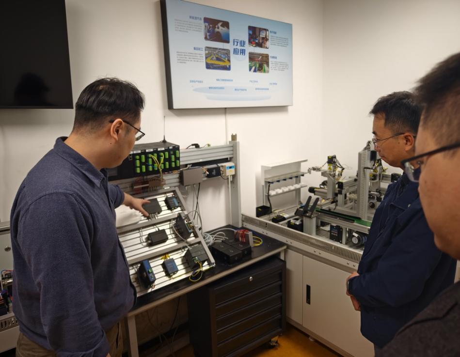 在新大陆工作人员的带领下,来访人员参观了企业智能化生产线展示区,现场观看了 自动化设备、智能识别设备、智能终端及模拟生产线的运行演示。新大陆通过实景展示详细介绍了数字化生产流程、设备协同方式及相关技术体系,使参访人员对智能制造领域的核心技术和应用场景有了更加直观的了解。