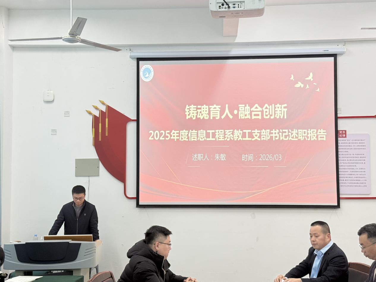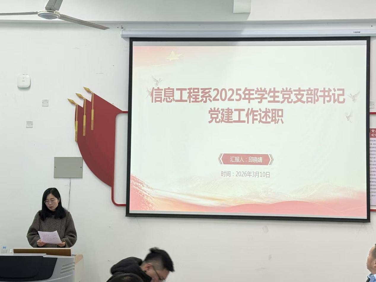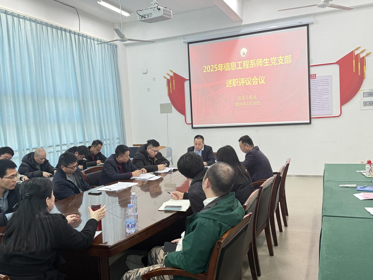 为深入学习贯彻习近平新时代中国特色社会主义思想和党的二十大和二十届历次全会精神,压紧压实基层党建工作责任,2026年3月10日下午,2025年度师生党支部书记抓基层党建工作述职评议会议在信息楼党员活动室举行。信息工程系全体党员参加会议。
