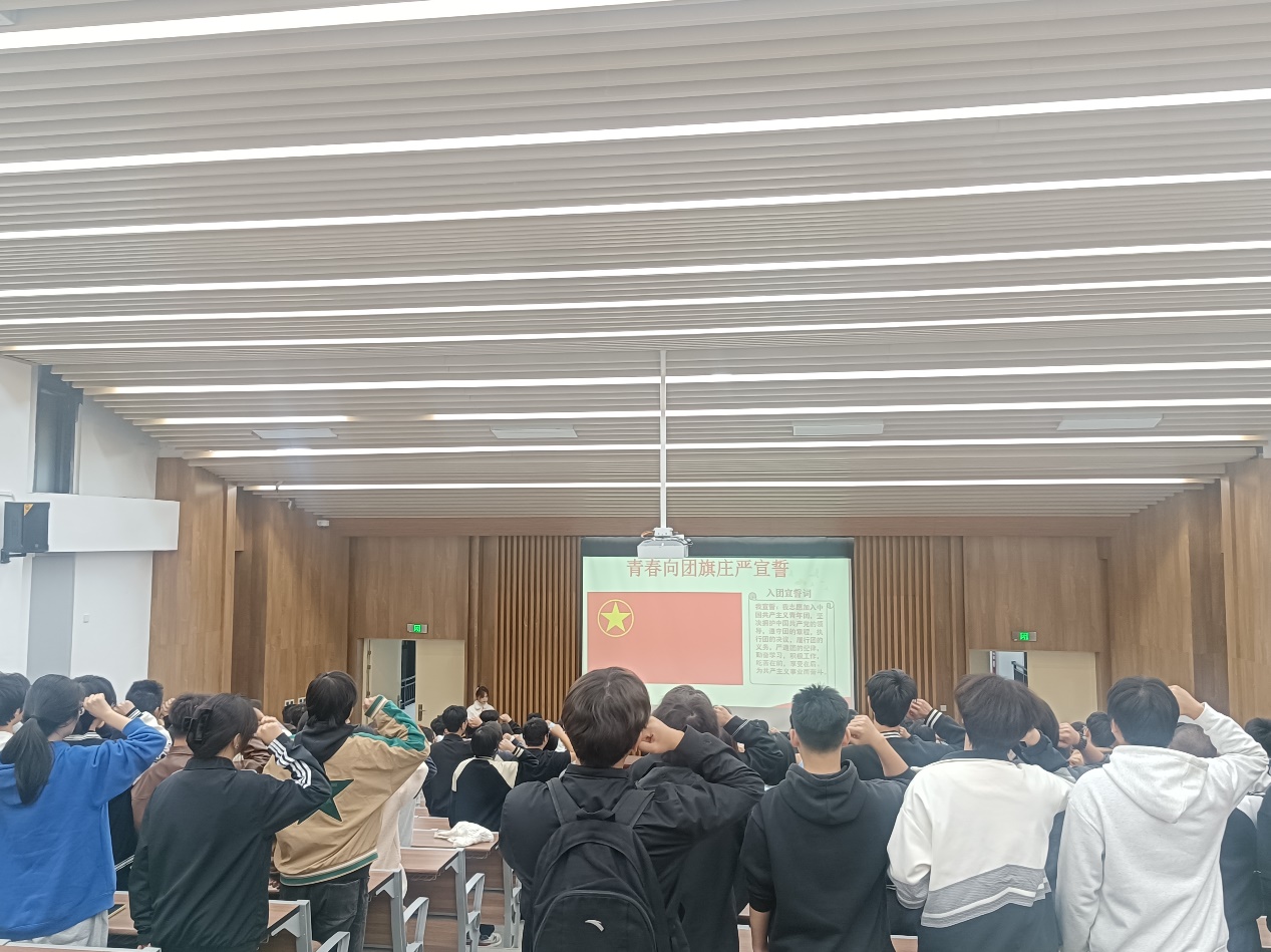 团课的最后,全体团员面向团旗,庄严宣誓:“我志愿加入中国共产主义青年团……为共产主义事业而奋斗!”铿锵有力的誓言在现场久久回荡,这既是对革命先辈的崇高致敬,也是对青春使命的郑重承诺。团旗所指,初心所向,此次团课让同学们深刻认识到,新时代青年的爱国,既要铭记历史不忘本,也要尊崇宪法守底线,更要以实际行动践行誓言。