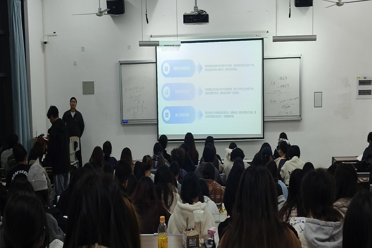 活动伊始,辅导员结合期末备考常见场景,以真实案例为切入点,深入剖析学生面临的双重挑战。心理层面,多门课程集中考核带来的学业负担、对成绩的过高期待、同伴间的隐形竞争等,易引发焦虑、拖延、孤独等负面情绪,进而导致复习效率下降、注意力分散;生理层面,熬夜刷题、饮食不规律、缺乏运动等不良习惯,会造成免疫力降低、精力不足,难以支撑高强度备考节奏。