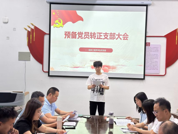 为进一步优化党员队伍结构、增强党组织活力,2025年6月5日下午,信息工程系学生党支部在信息楼北307党员活动室隆重召开了预备党员转正大会。本次会议的核心议题是讨论曾德兴、刘海洋、李文彬、陈鸿靖、陈文浩五位同志的预备党员转正事宜。会议由学生党支部书记邱晓婧主持,支部全体师生党员出席会议。党总支书记罗建军、党总支副书记郑健以及五位预备党员的培养考察人列席了本次会议,共同见证这一重要时刻。