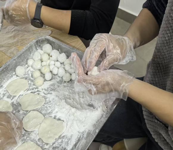 美食制作区热火朝天,同学们围桌而立,揉面、擀皮、填馅、捏合,配合默契。洁白的面粉沾满指尖,鲜美的馅料托于掌心,大家将满心的祝福揉进这团圆的美味中。无论是褶皱匀称的传统饺子,还是造型别致的元宝、月牙饺,都引得阵阵赞叹。来自西藏的洛松曲吉同学热情加入其中,一边分享高原家乡的冬至习俗,一边与同学们切磋包饺子、搓汤圆的技艺,天南海北的乡音与笑语交织,汇成了一幅温馨的冬至团圆图。